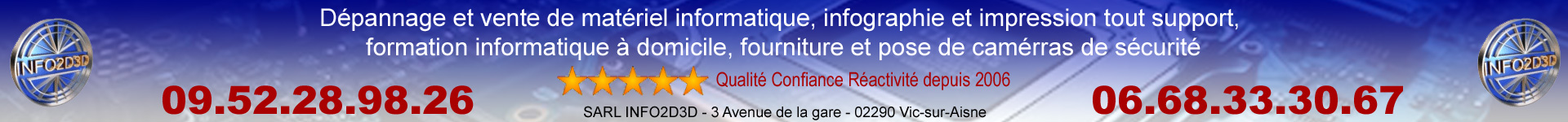Petite anecdote sur le nom de la société INFO2D3D, j'ai retenu INFO pour informatique et infographie et 2D3D car je propose des services en infographique en 2D ainsi qu'en modélisation 3D, le cumule forme INFO2D3, mais après 18 années de service je me dis que SOS PC ou un nom du genre aurait peut-être été plus simple et plus facile d'utilisation :)